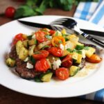3. Add zucchini, garlic, onion and remaining 1 tsp (5 mL) herbes de Provence to pan. Cook, stirring, for 2 to 3 minutes or until onion starts to soften. Add tomatoes and continue to cook, stirring often, for 2 to 3 minutes. Remove from heat, stir in feta and parsley (if using) and serve over steaks.