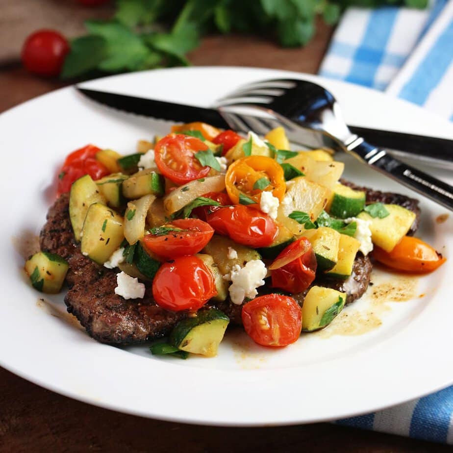 A super-simple rendition of ratatouille served with a seasoned minute steak makes for a quick dinner that is colourful, fresh and tasty.